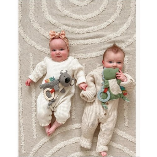Découvrez Bitzy Crinkle™, un adorable jouet sensoriel qui éveille les sens. Avec son tissu en coton naturel doux, ses rubans texturés et son anneau de dentition tressé, bébé adorera explorer ce nouvel ami. Regardez votre tout-petit s'émerveiller devant les bruits de froissement et les rires !