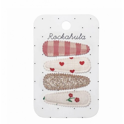 Mélangez et assortissez ce joli lot de quatre pinces, comprenant notre tissu vichy Taylor, un tissu doré pailleté, notre tissu à fleurs sauvages et notre tissu à cœur d'amour . Portez-les une à la fois ou toutes en même temps !