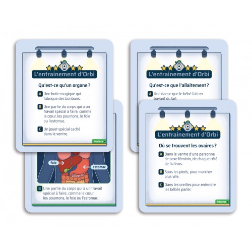 Les cartes «L'entrainement d'Orbi» permettent aux joueurs de consolider les apprentissages de l'album grâce à des questions à choix de réponses amusants.