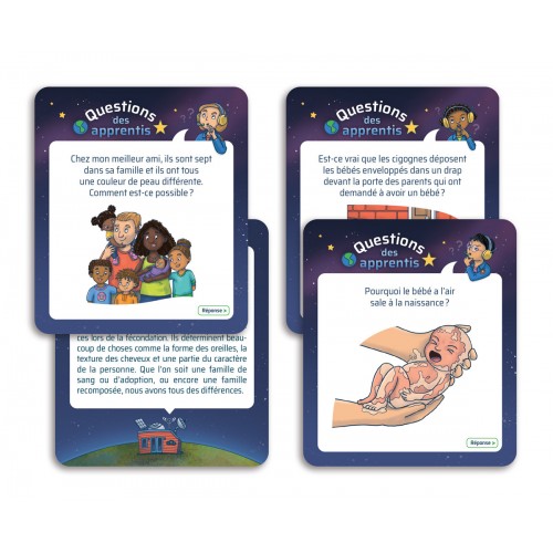 Les cartes «Questions des apprentis» invitent les joueurs à répondre aux interrogations que les enfants peuvent avoir au sujet de la reproduction, de la grossesse et de la naissance.